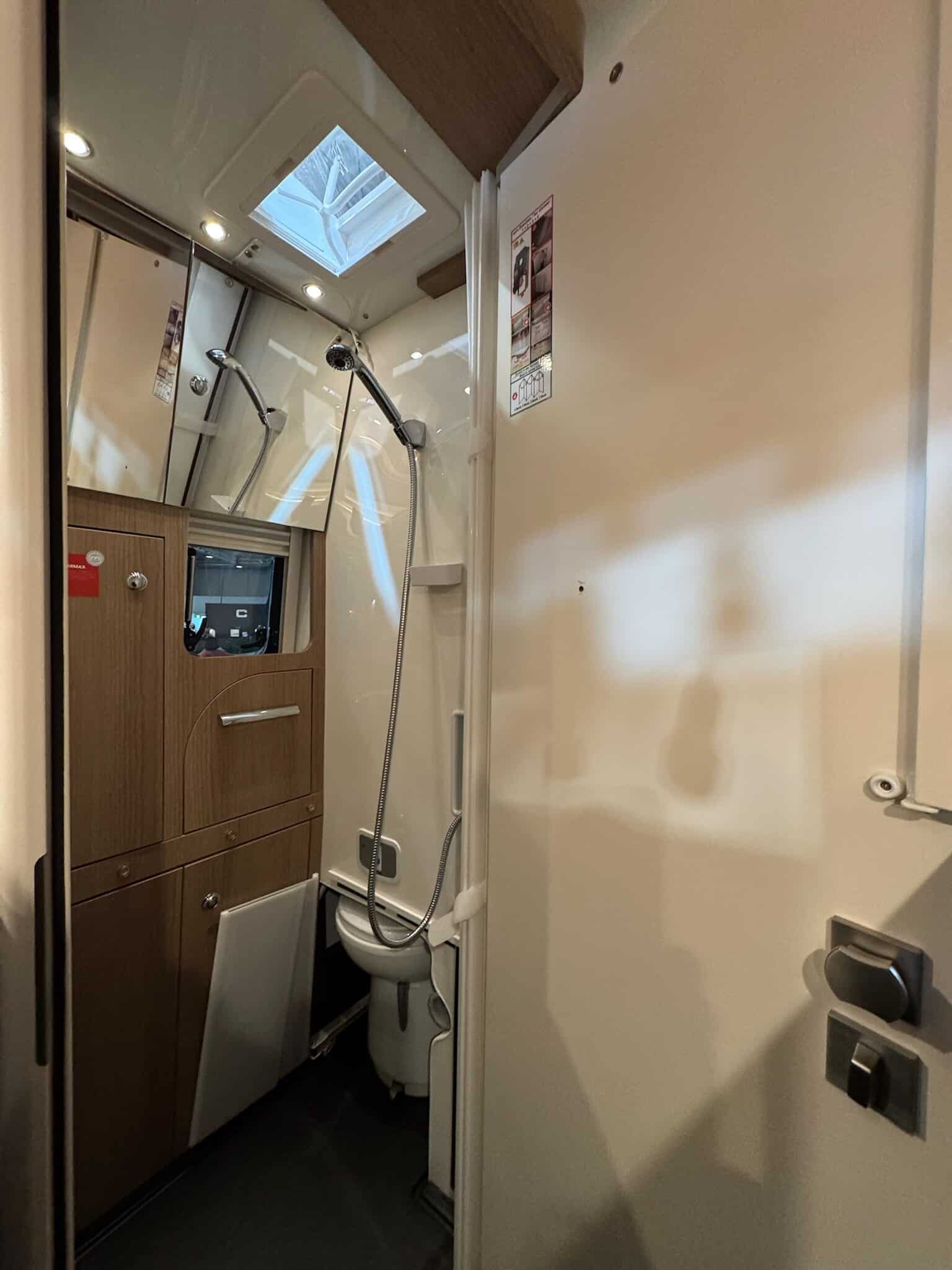 La soluzione più intelligente per i bagni van. Il “bagno Supermax” si espande nel corridoio grazie a una porta a libro innovativa. La doccia diventa enorme, estendendosi fino al soggiorno.
