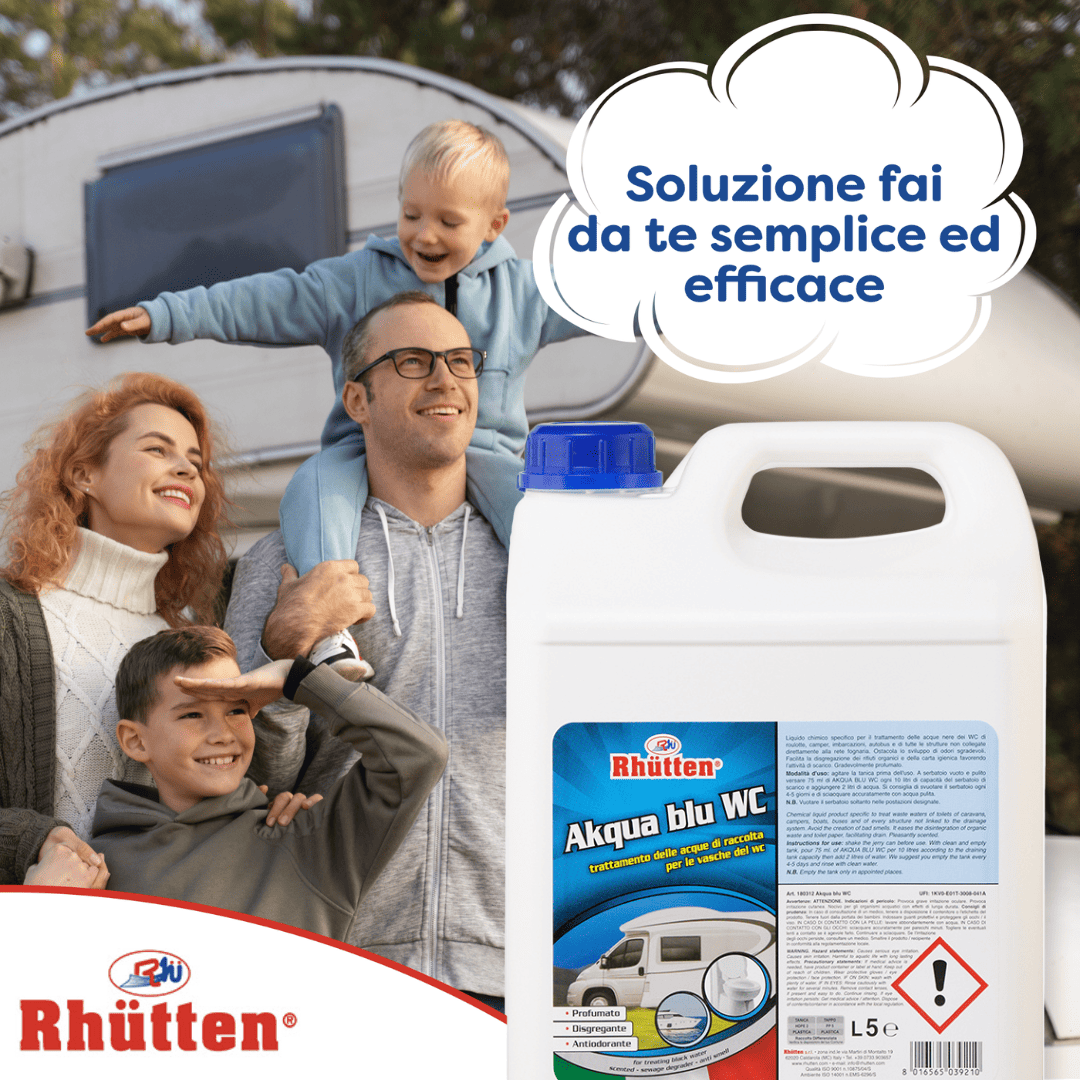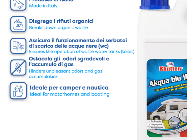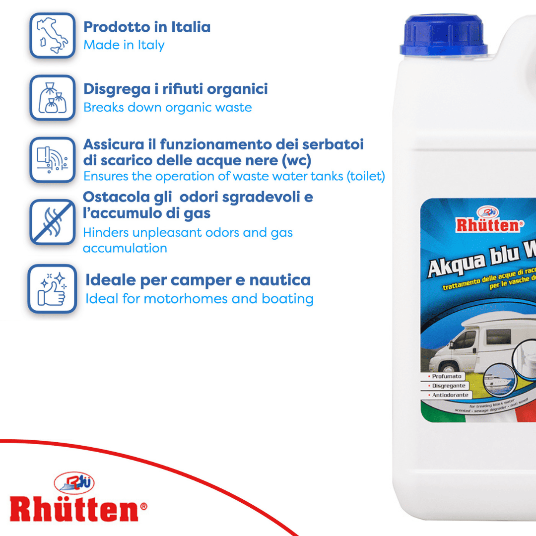 Rhutten AKQUA BLU WC è un prodotto “Made in Italy” specificamente progettato per il trattamento delle acque nere nei WC di camper, caravan, imbarcazioni e altre strutture non collegate alla rete fognaria. Con una formula chimica che previene lo sviluppo di odori sgradevoli e facilita la disgregazione dei rifiuti organici, AKQUA BLU rappresenta un’opzione economica ma efficace.