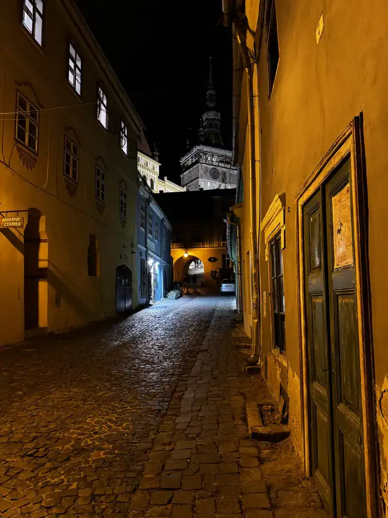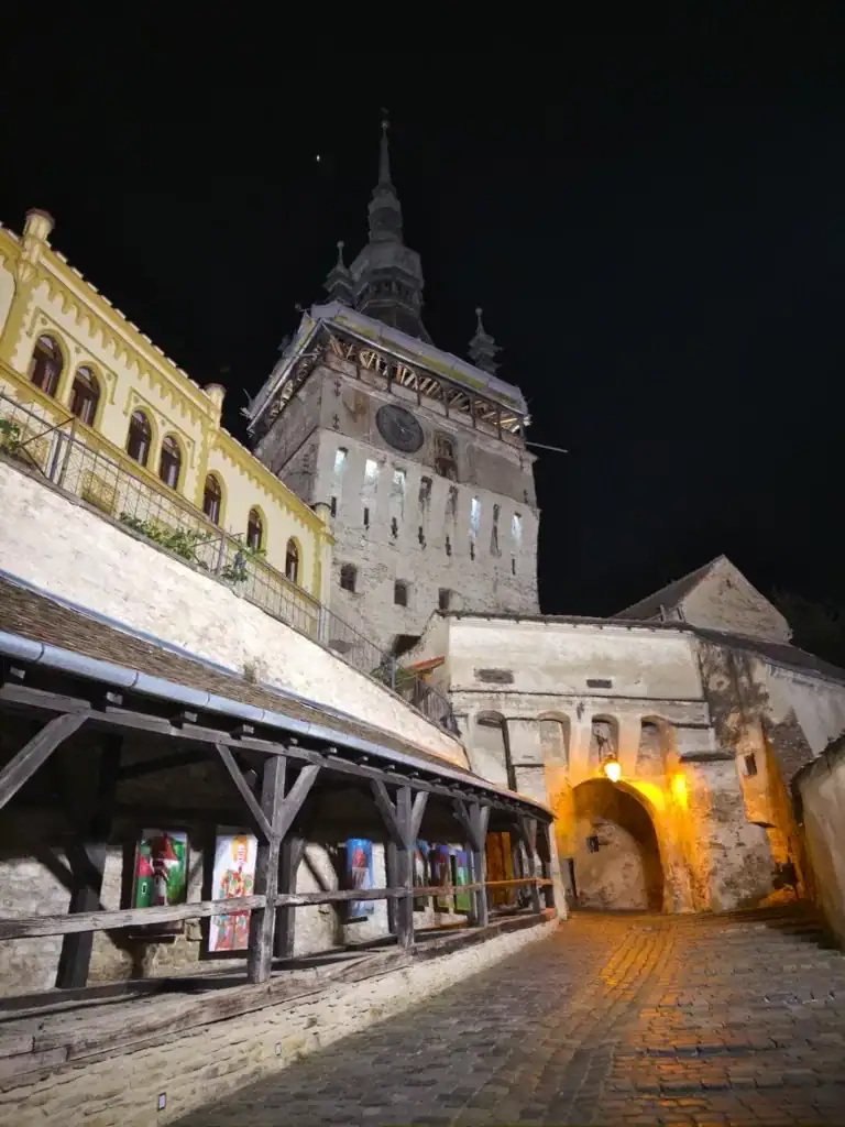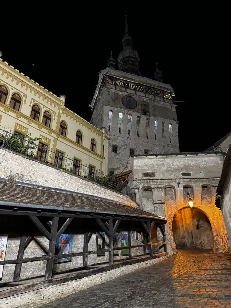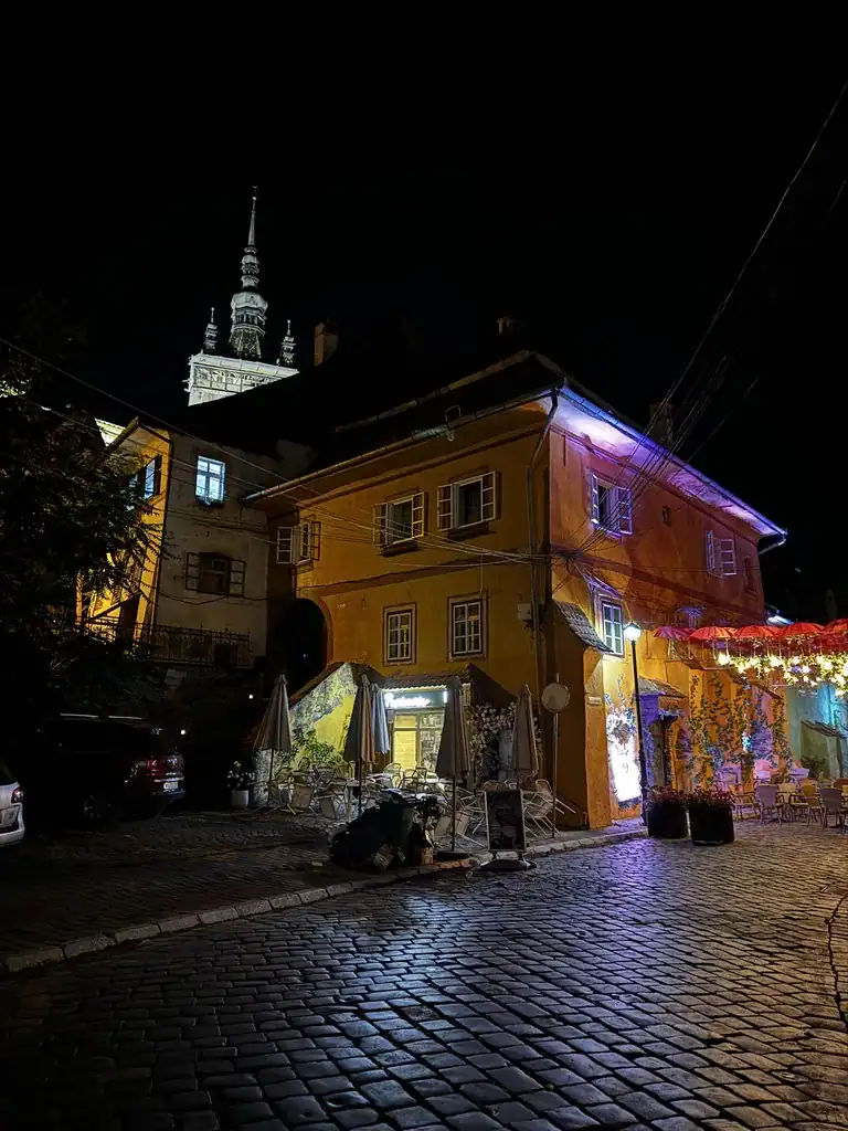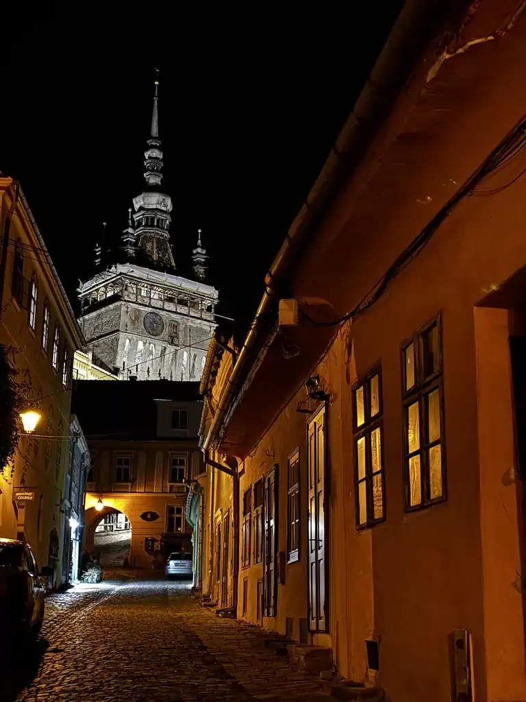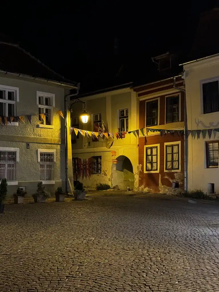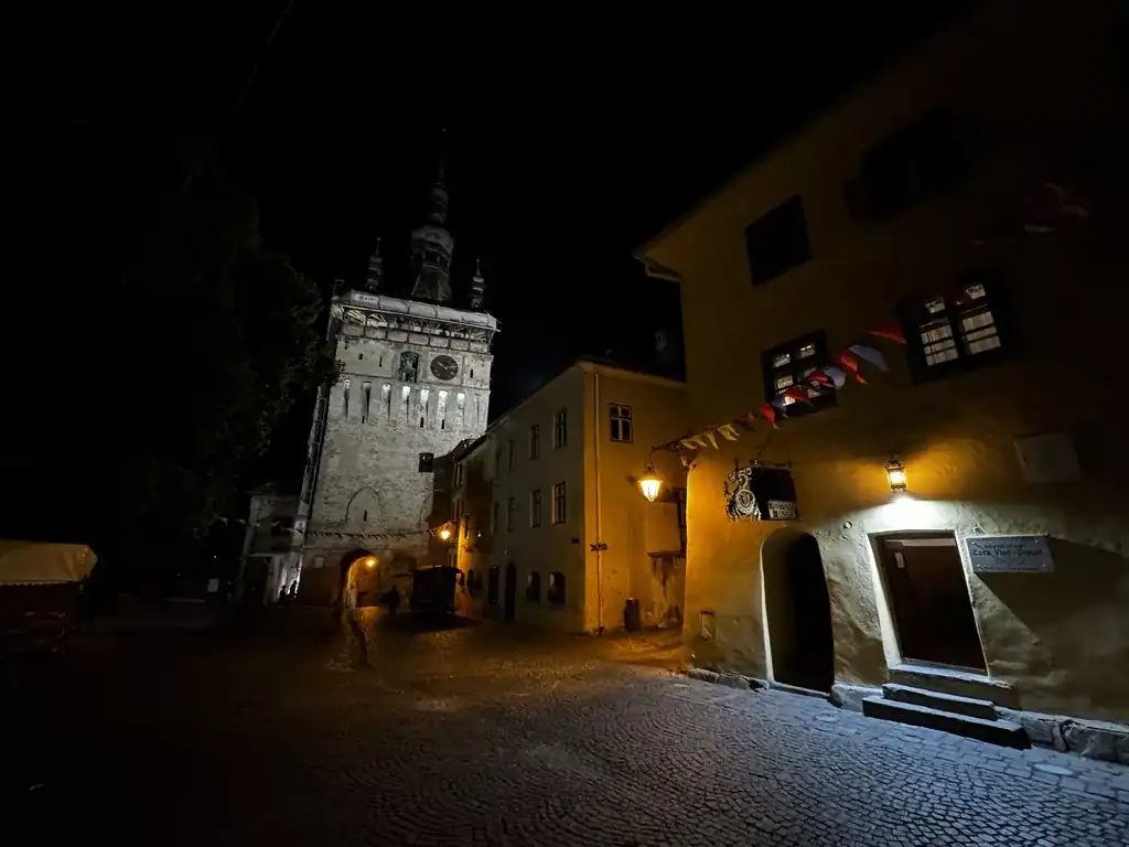 Sighișoara ci ha accolti con le luci dorate del tramonto e l’atmosfera sospesa di un borgo fuori dal tempo. Siamo arrivati in serata, e inizialmente abbiamo sostato con il camper nella grande piazza del mercato, proprio ai piedi della cittadella. Un parcheggio ampio e strategico, perfetto per l’accesso immediato al centro storico.