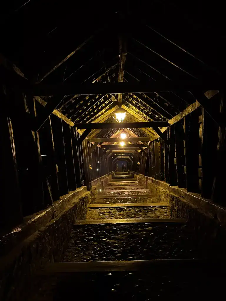 Durante la visita serale del giorno prima, avevamo già percorso anche la famosa Scala Coperta. Costruita nel Seicento per proteggere gli studenti e i fedeli durante la salita alla Chiesa sulla Collina, oggi conserva 174 gradini in legno, avvolti da una struttura lignea che sembra una galleria sospesa nel tempo. Salirla di sera, con le luci soffuse e il silenzio, è stata una delle esperienze più suggestive del viaggio: in cima, la vista sulla cittadella illuminata ci ha lasciato senza parole.