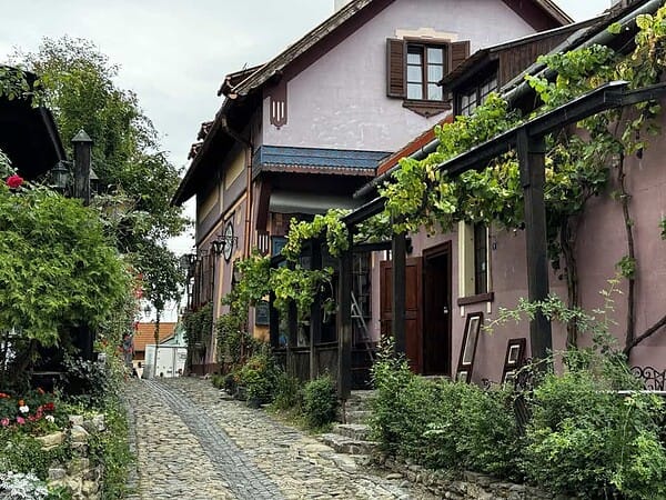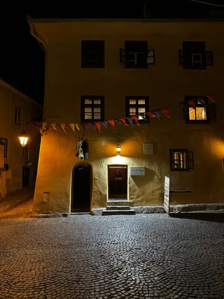 Nonostante la giornata di viaggio, non abbiamo resistito alla tentazione di salire subito: la visita serale si è rivelata una delle esperienze più affascinanti di tutto il nostro itinerario. Le strade acciottolate, illuminate solo dai lampioni e dalle finestre, restituivano un silenzio ovattato, interrotto solo dai nostri passi e da qualche voce lontana. I colori delle case, già vivaci di giorno, assumevano tonalità ancora più intense e intime nella luce artificiale. Sembrava davvero di camminare dentro una fiaba.