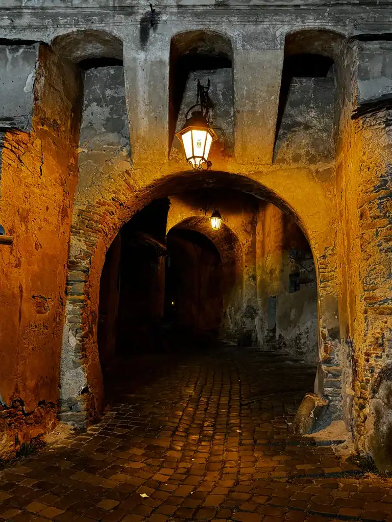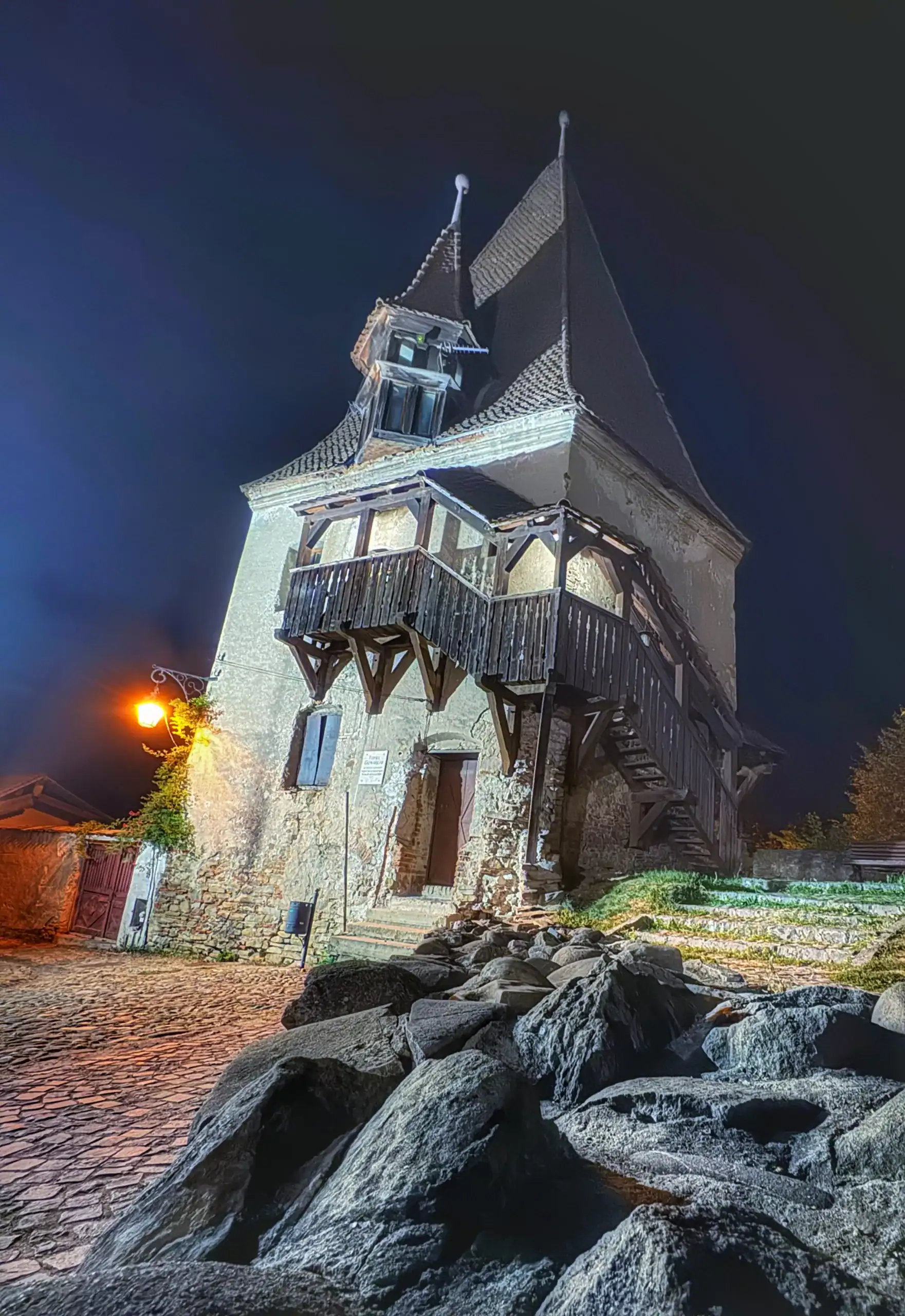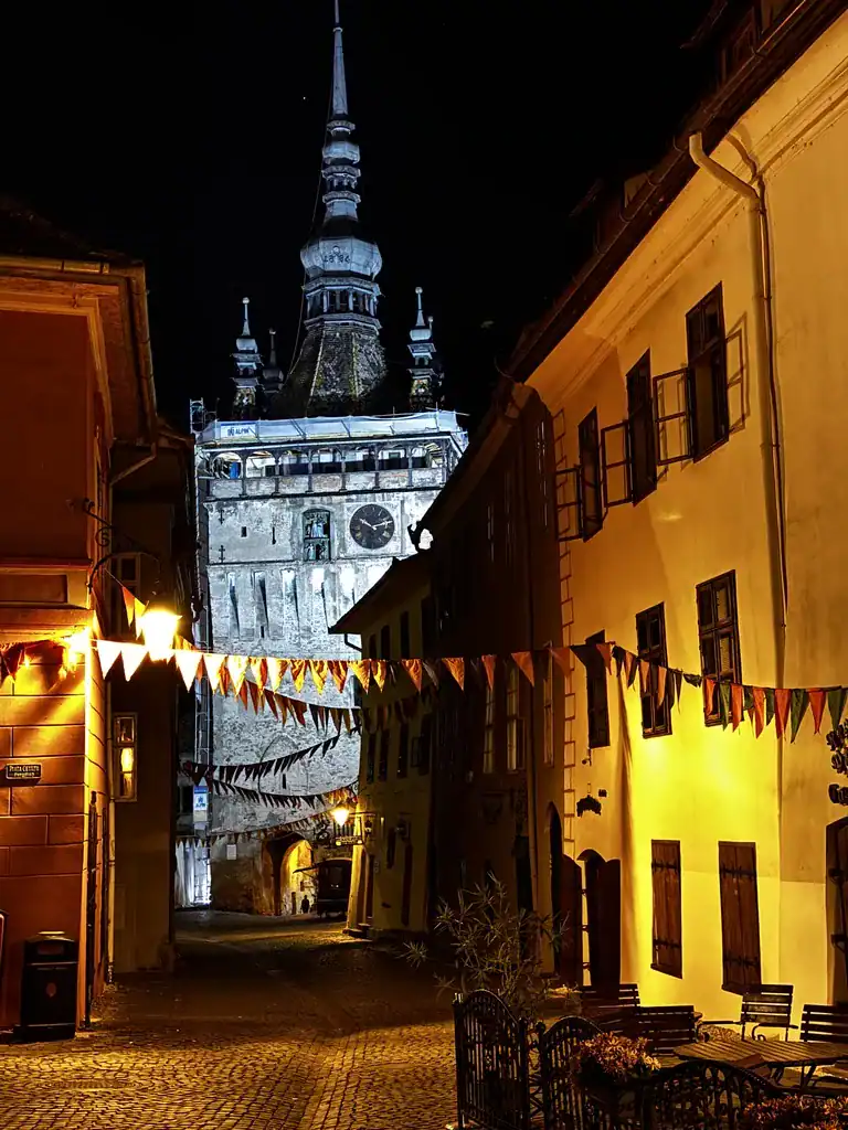 La Torre dell’Orologio, simbolo di Sighișoara, domina la piazza principale con la sua struttura imponente e il tetto appuntito dai riflessi dorati. Salire fino in cima è quasi un rito: gli scricchiolii dei gradini in legno, le piccole finestre che si aprono man mano che si sale, e poi — finalmente — la vista. Da lassù, i tetti rossi e le case colorate si allineano come tessere di un mosaico, mentre oltre le mura si allunga la valle con il suo verde tranquillo.